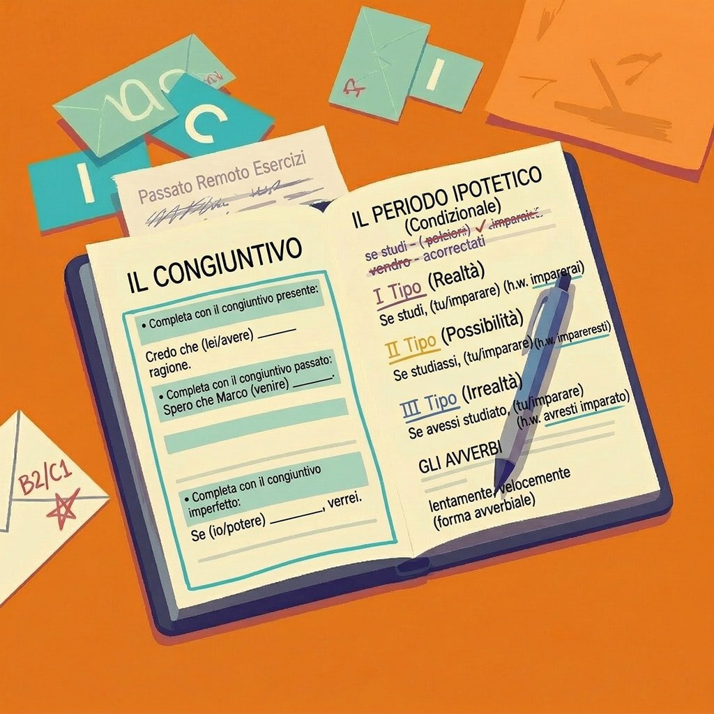 La prima categoria di esercizi è dedicata alla grammatica. Questi esercizi sono stati progettati per aiutarti a consolidare le regole grammaticali spiegate nelle mie video-lezioni. Ogni esercizio è strutturato per offrire un feedback immediato, permettendoti di identificare e correggere eventuali errori in tempo reale. Questo approccio ti aiuterà a rafforzare la tua comprensione delle strutture grammaticali e a migliorare la tua capacità di utilizzarle correttamente in vari contesti.